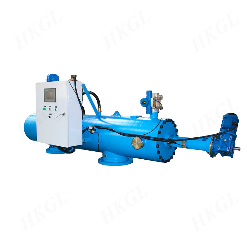 过滤器的清洗机构是一个不锈钢316L材质,旋转及上下运动的吸吮扫描器,它是空心结构,在吸污器上均匀分布着若干个吸吮口,吸吮扫描器内部与一个3”排污阀相通,在排污阀打开时,过滤器内部水压与外部大气之间形成的压差使每个吸嘴产生强劲吸力,在每个吸吮口,水流从滤网外向内反向高速流出将杂质冲下来进入扫描器并通过排污阀排出,吸吮口处的高速反向水流将滤网上的顽固杂质吸走。吸吮扫描器由一个连有丝杆装置的双向电力马达驱动,按照固定的转速作螺旋式的运动,这样多个吸嘴就能吸遍整个滤网内表面,这个过程大约需要35-60秒钟。在整个反清洗过程中,系统不断流。